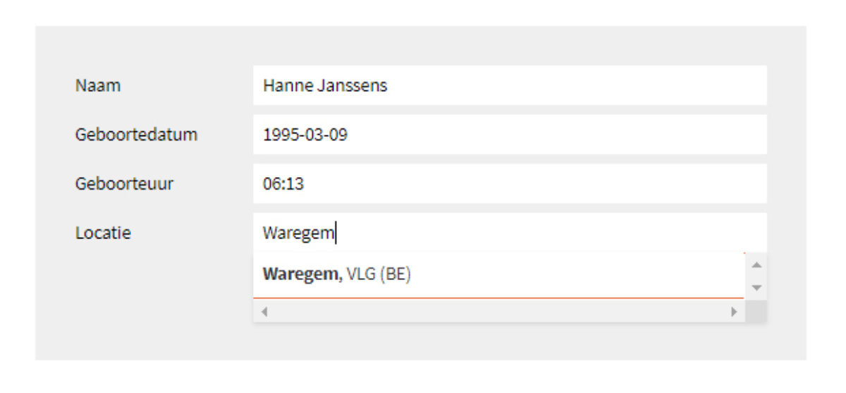 - je vult de naam van je woonplaats in, maar duidt de juiste gemeente/stad nog eens extra aan in het keuzemenu dat automatisch verschijnt.