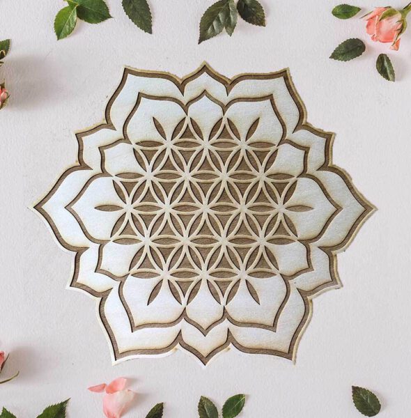 Deze unieke Flower of Life Lotus Crystal Grid is vervaardigd uit berkenhout. Losse edelstenen en kristallen kunnen apart aangekocht worden. Je kan allerlei soorten edelstenen en kristallen gebruiken: in elk kleur, vorm en maat die jij mooi en aangenaam vindt om mee te werken.